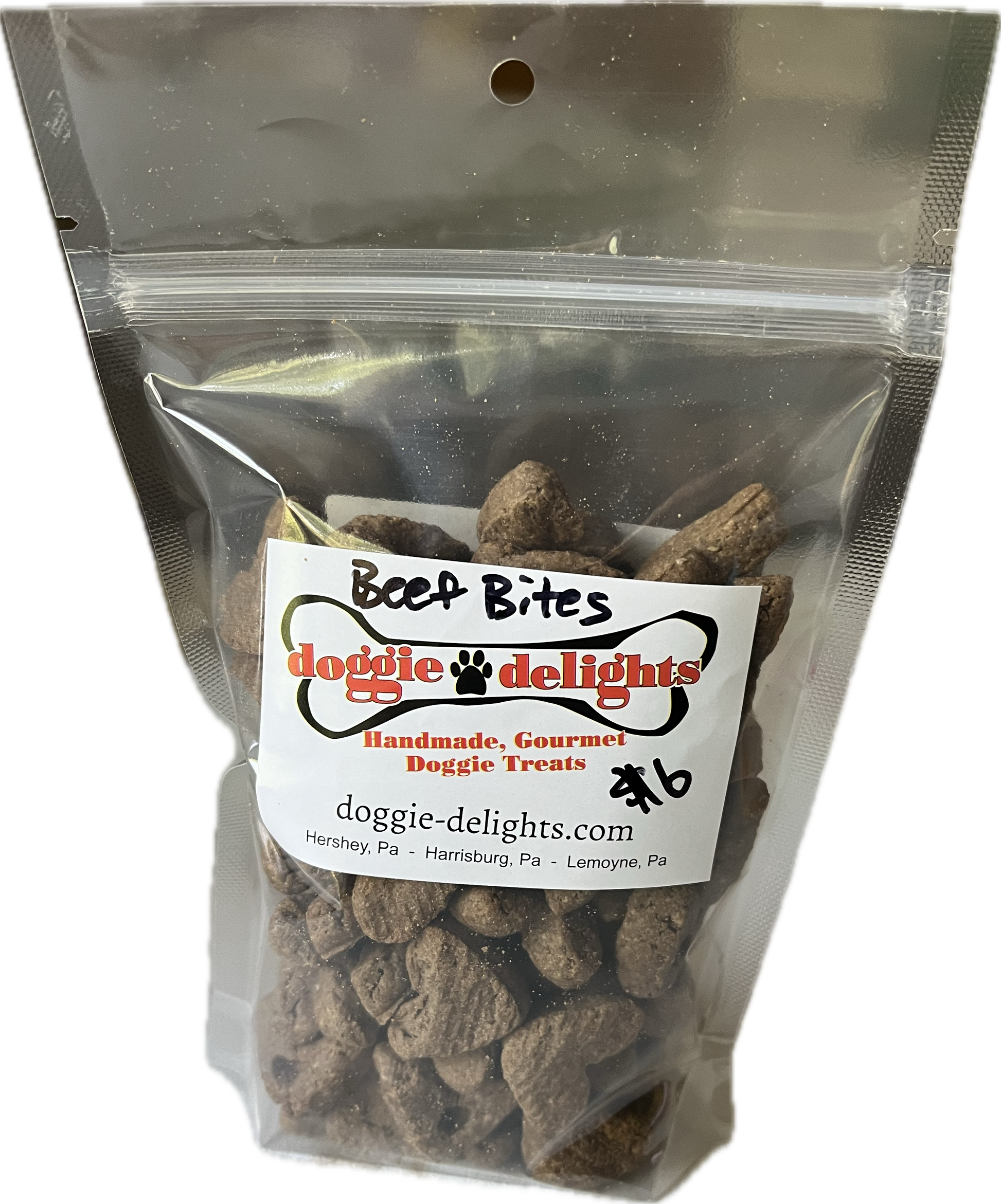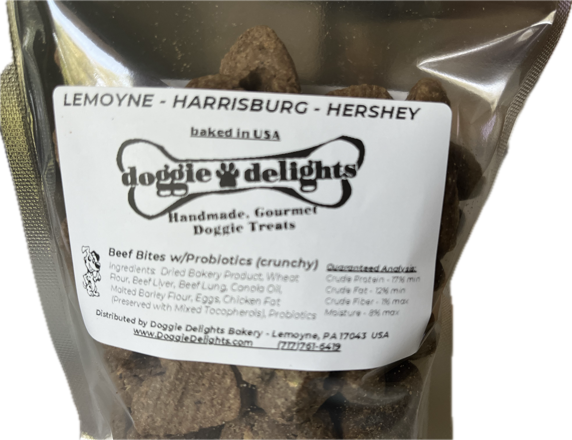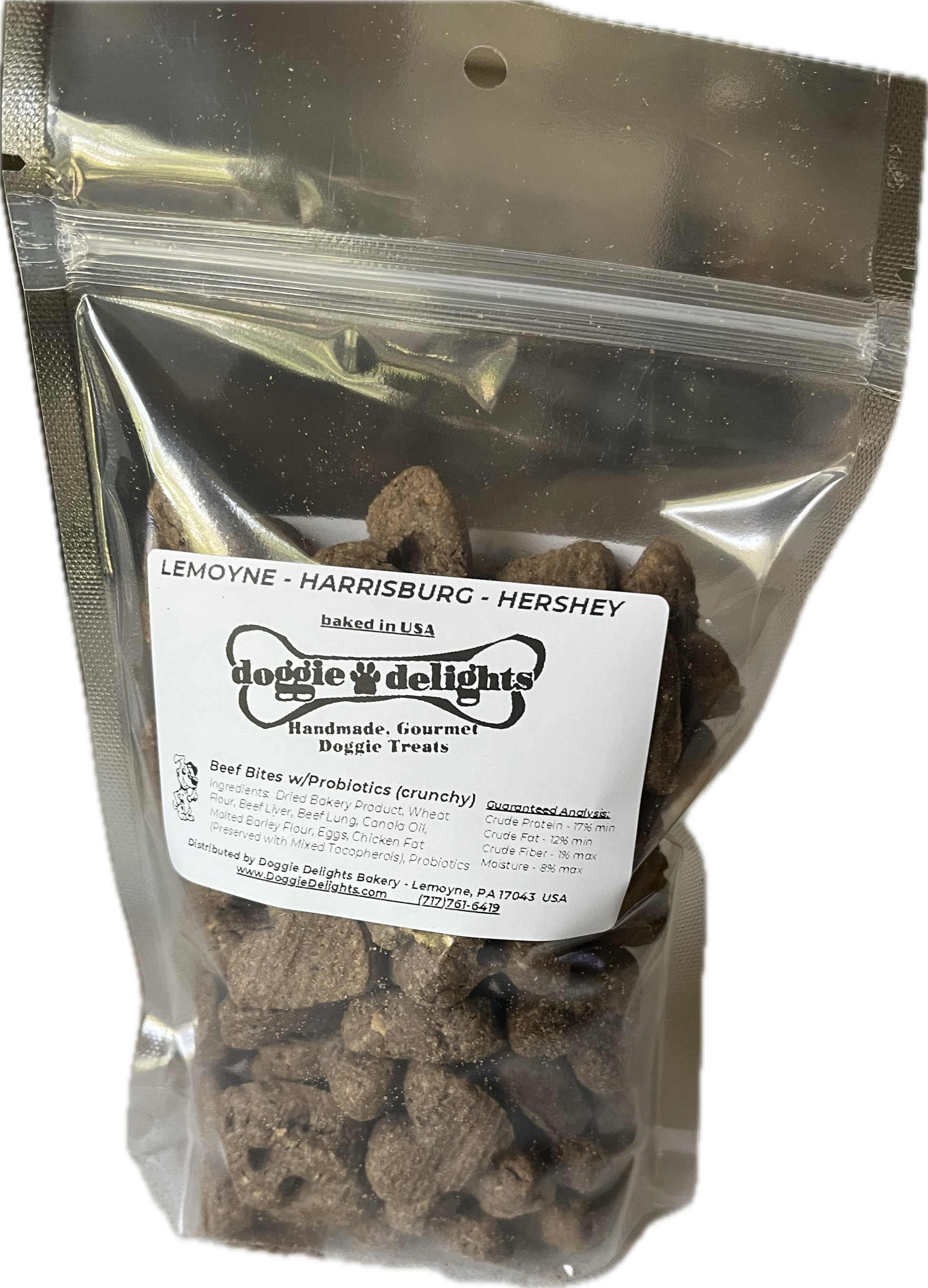Doggies love our Beef Bites & Probiotics because they love the beefy taste. Dog owners love treating their dog with these treats because it promotes a strong immune system, gut health and digestive Balance. Probiotics are the good bacteria your dog needs for overall health and vitality. Find the best for your pup at Doggie Delights Bakery !!!