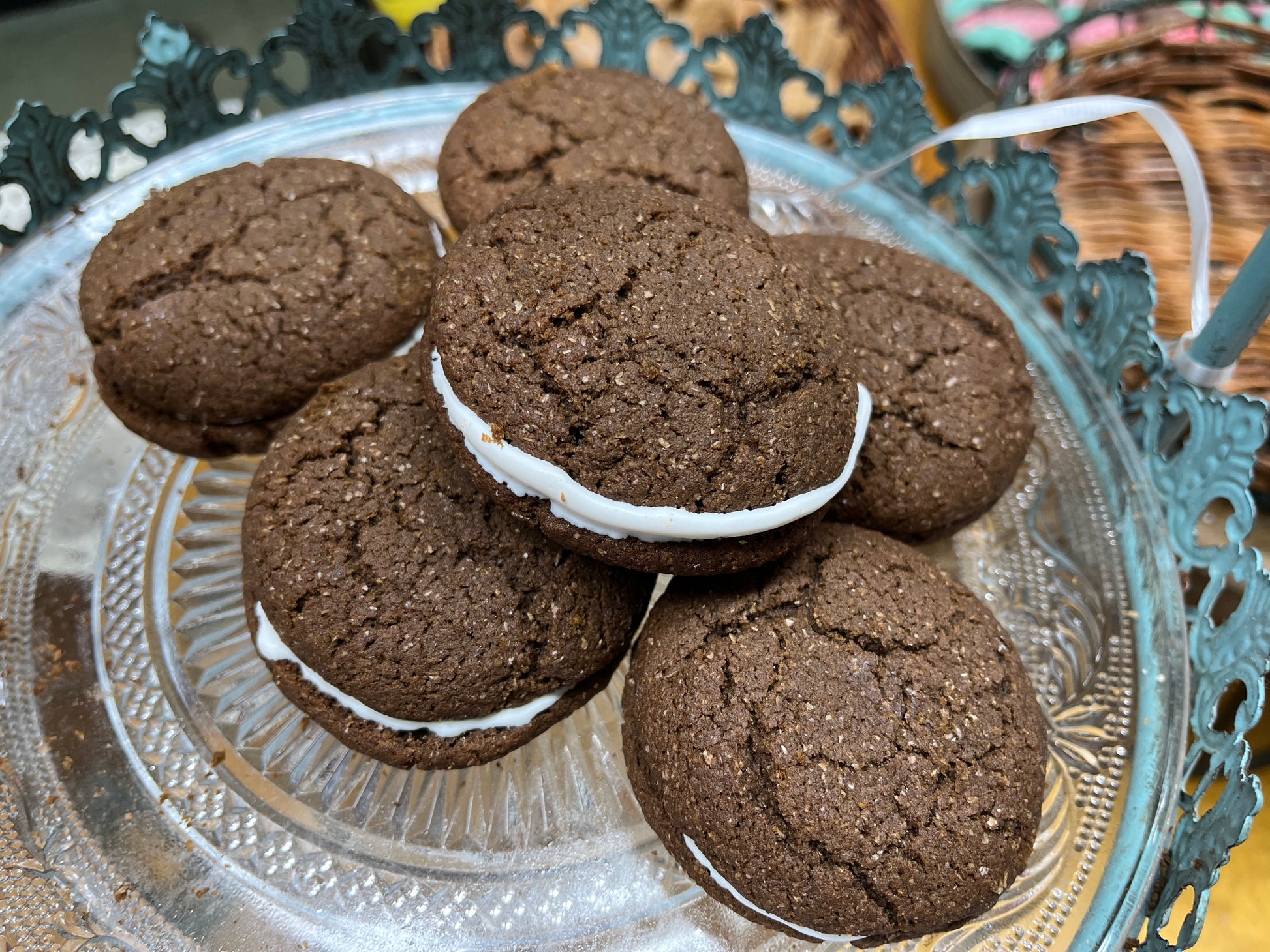 Pups get their very own Woofie Pies made from our carob cookie dough and melted yogurt coating filling.